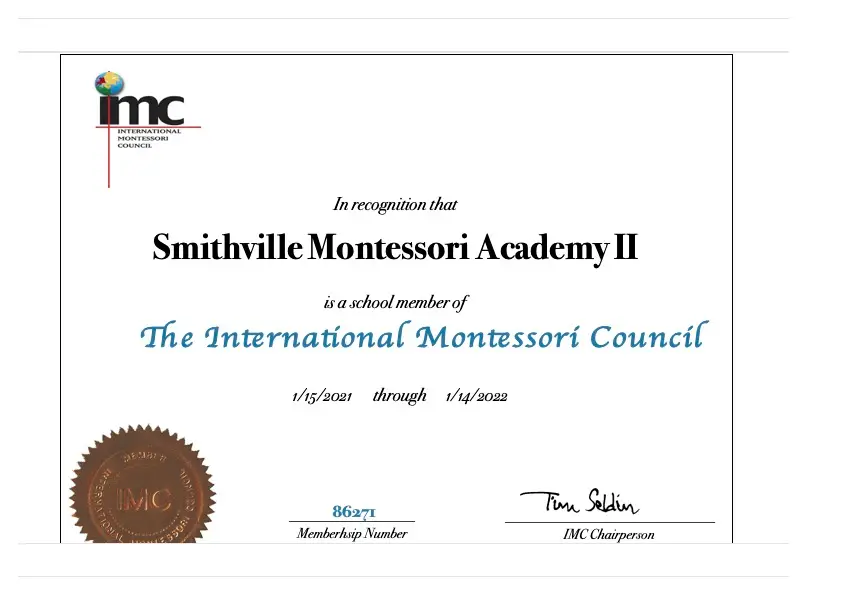 Smithville Montessori Academy Inc. II (SMAII) encourages the development of the whole child by providing a comprehensive Montessori education, cultivating independent thought and foundational skills as well awareness of each child’s environment; empathy for others; social ease and confidence. We strive to create an environment that inspires children to develop inner discipline, self-assurance, and a love for learning. Our respect for uniqueness of each child helps to develop lifelong skills during periods of their greatest readiness and sensitivity.