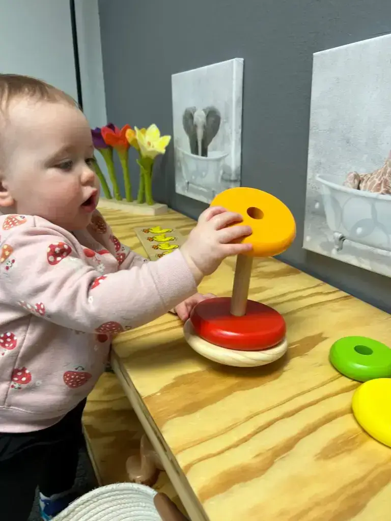 Emphasis is placed on the environment, which includes a variety of mobiles, light-reflecting prisms, textural objects, pleasing sounds, and age-appropriate Montessori materials.